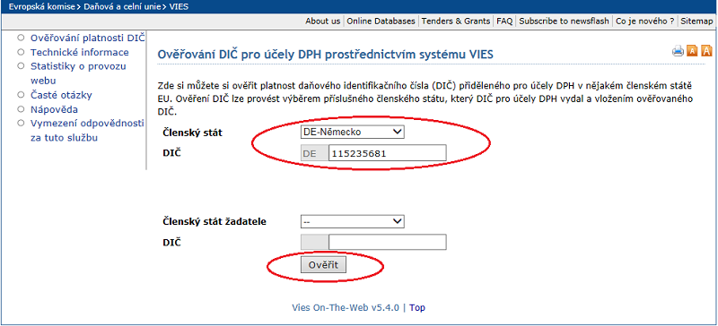 Ověřit DIČ pro účely DPH lze prostřednictvím systému VIES. Zadejte členský stát, DIČ a klikněte na „Ověřit“.