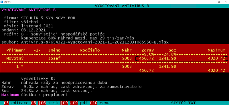 Zaměstnanec má souběžné pracovní poměry (HPP a VPP). Byl 14 dnů v karanténě. Zaměstnanec vystoupí ve vyúčtování A na dvou řádcích. Sečíst do jednoho řádku je nutno ručně (každý pracovník se uvádí pouze jednou). V sestavě bude zaměstnanec označen znakem + a v legendě se zobrazí informace "+ souběžné pracovní poměry, prověřte maximum".