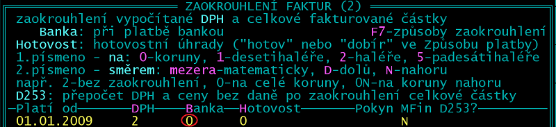 Zápis určuje, že od 1.1.2009 bude DPH spočítána na dvě desetinná místa, celková částka u faktur bezhotovostních bude uvedena na dvě desetinná místa, celková částka u hotovostních faktur bude zaokrouhlena na celé koruny matematicky a výpočet podle pokynu D-253 nebude použit. Pro zaokrouhlení DPH a použití Pokynu MFin D253 je rozhodující DatumDPH, pro zaokrouhlení celkové částky (při platbě bankou či hotovostní) rozhoduje datum vystavení faktury.