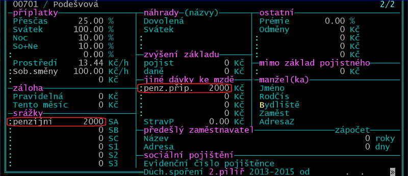 Platbu penzijního připojištění připravte v kartě zaměstnance (/Zaměstnanci /Osobní evidence) takto: