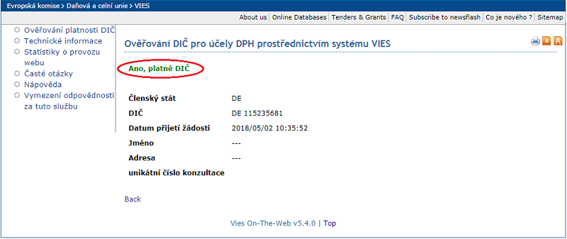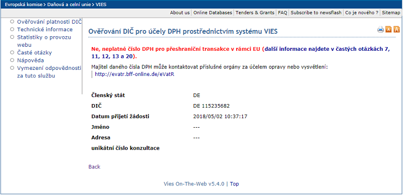 2) Ne, neplatné číslo DPH pro přeshraniční transakce v rámci EU (další informace najdete v častých otázkách 7, 11, 12, 13 a 20).