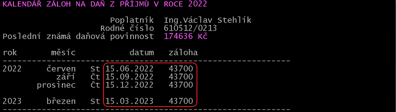 Úterý 15. března, středa 15. června, čtvrtek 15.září a čtvrtek 15. prosince 2022 jsou termíny splatnosti čtvrtletních záloh na daň z příjmů u poplatníků, jejichž poslední známá daňová povinnost přesáhla 150 tisíc Kč. Čtvrtletní zálohy se platí ve výši 1/4 poslední známé daňové povinnosti.
